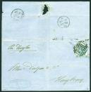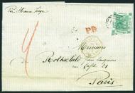 1873 (23 Aug.) An entire letter from HK to Paris, France, bearing QV 24c green tied by 'B62' obliterator, stamp damaged. Matching