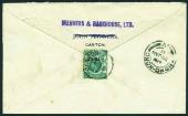 1917 (20 Jan.) A cover from Canton to HK, on reverse bearing opt. 'CHINA' on HK KGV 2c green, tied by the unusual 'CANTON'