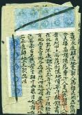 1919 A contract selling land, bearing Kansu 2c light blue stamp duty strip of 5 and block of 10, cancelled by black cross lines. Fine.