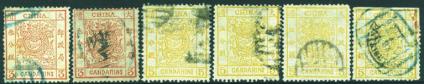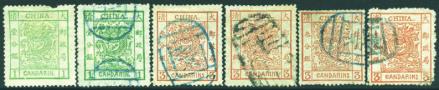 1878-85 Large Dragon mixed printings, 1 cd and 5 cds thin paper, 3 cds thick paper rough perf. Chan 1, 3, 11. all tied by seal chop.