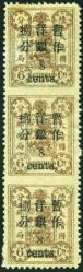 1897 Dowager small figures 8c on 6 cds brown, vertical strip of 3 imperforate between variety, mint original gum hinged with red