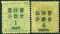 1897 Small Dragon Large figures surch. 1c on 1 cand and 5c on 5 cands, both with dry gum and toned. Chan 34, 36. Photo