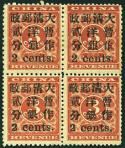 1897 Small figures surcharged 2c on 3c block of 4, top right stamp inverted 'S' of 'cents' and lower right stamp comma after 'cents'