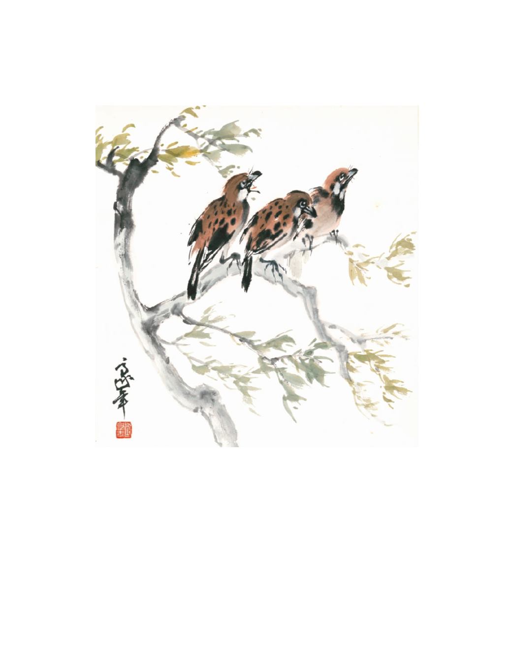 Ou Haonien (1935-) Scroll Painting - Three Birds Singing.
