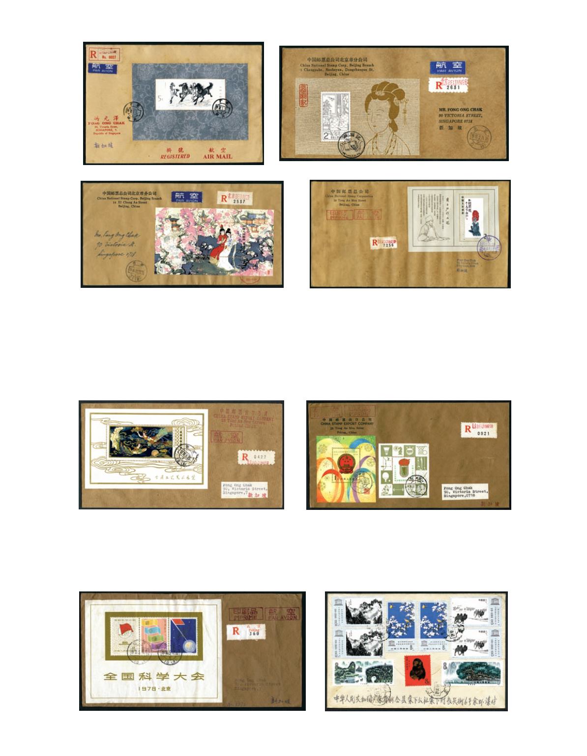 6 reg. covers from Peking or Guangdong to Singapore, all franked with J or T miniature sheets or stamps, fine. Photo