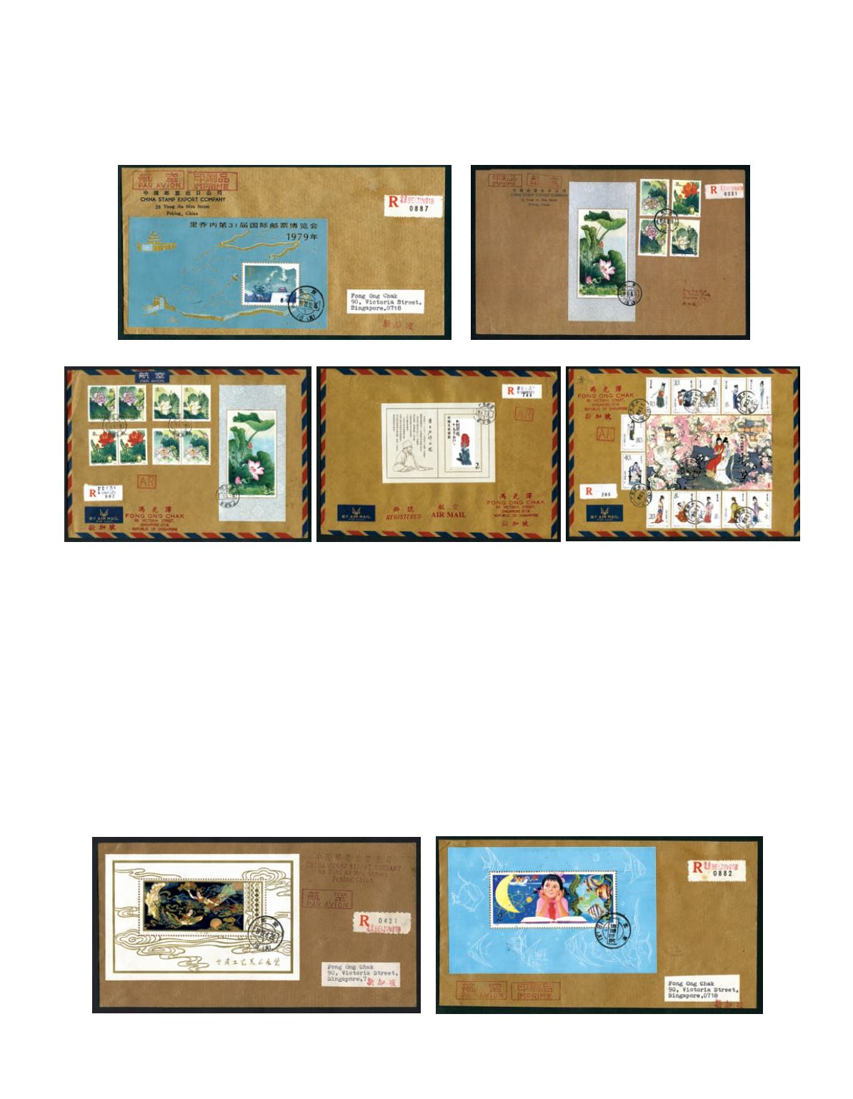 11 covers from Peking or Guangdong to Singapore franked with (J), (T) miniature sheet or (J), (T) stamp sets. Fine. Photo