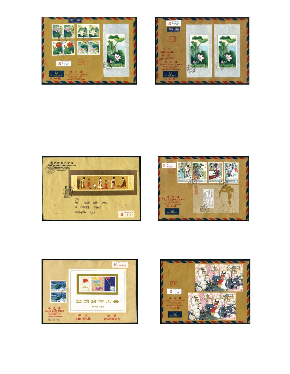 10 covers from Peking or Guangdong to Singapore franked with (T) miniature sheet of (J), (T) stamp sets. Fine. Photo