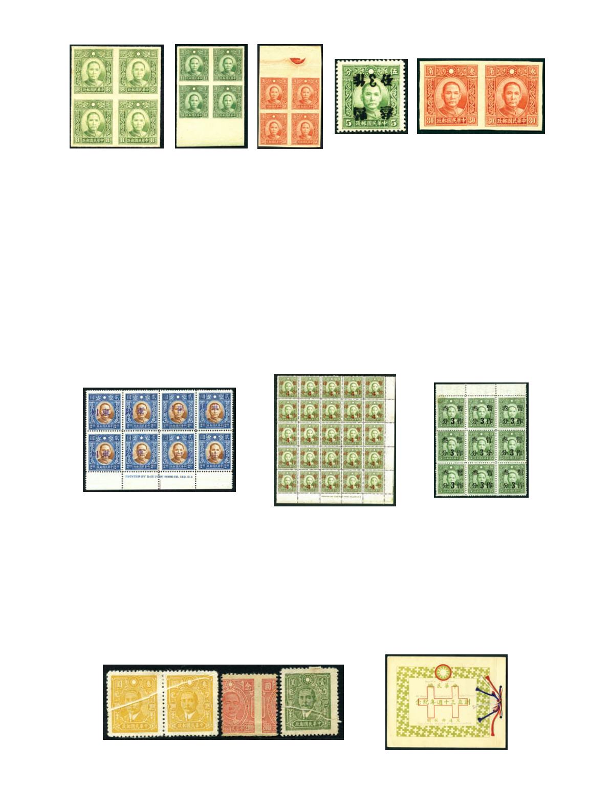 1940 Surcharged 3c on 5c on SYS HK Dah Tung print block of 9 with top sheet margin, Kiangsi surcharge, center stamp with lower