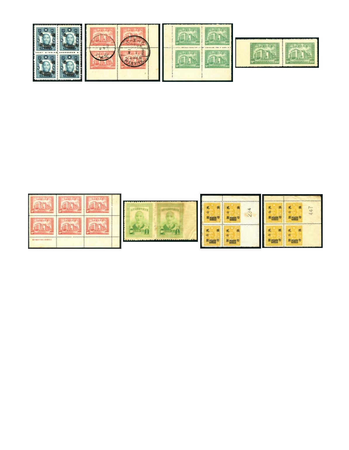 1947 CNC Shanghai Dah Yeh surcharge on SYS $3,000 on $3 Paicheng print block of 4 with imperf. at right variety, unused and a