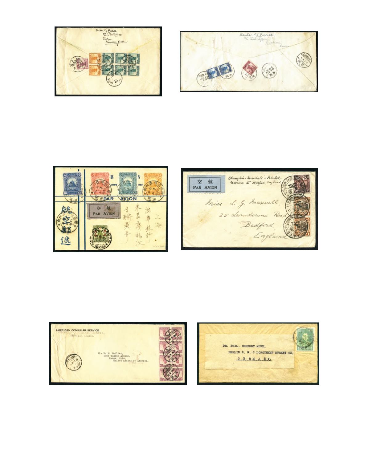 Bedfore, England, bearing Peking 2nd print Reaper 20c and Hall of Classics $1 in pair, tied by char. 'SHANGHAI' FFC comm.