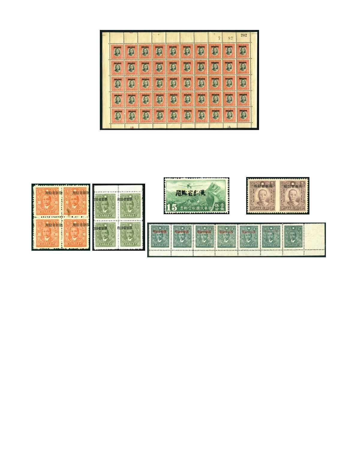 15c scarlet, plus 1938 Shanghai opt. 5c, 15c and 20c, total 100 sets in complete sheets, unmounted and tropical gum toning. Chan