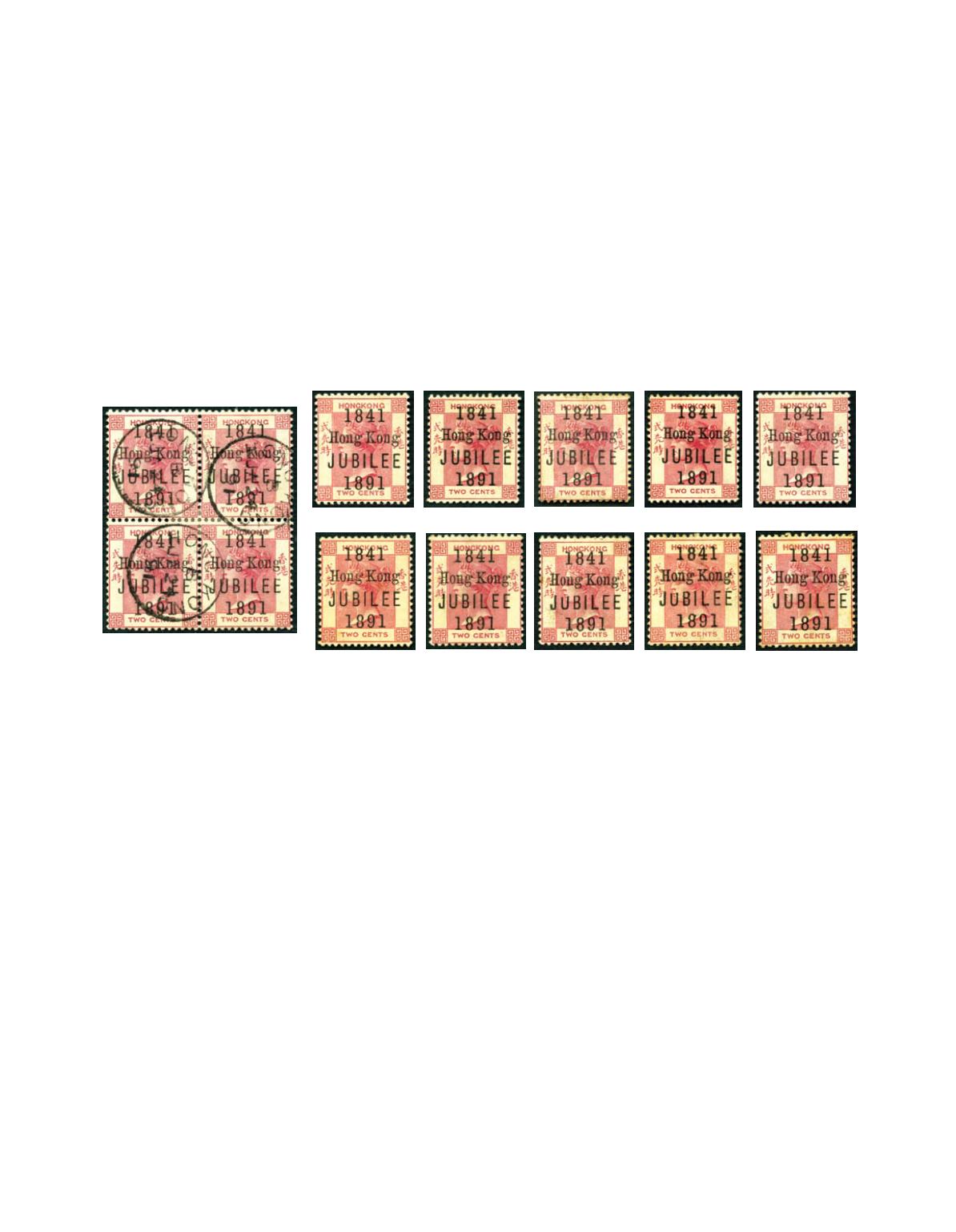 1891 Jubilee 2c carmine block of 4, tied by 'HONG KONG/24.1.91' cds x 3, bottom right stamp with borken first ' E' of 'JUBILEE'