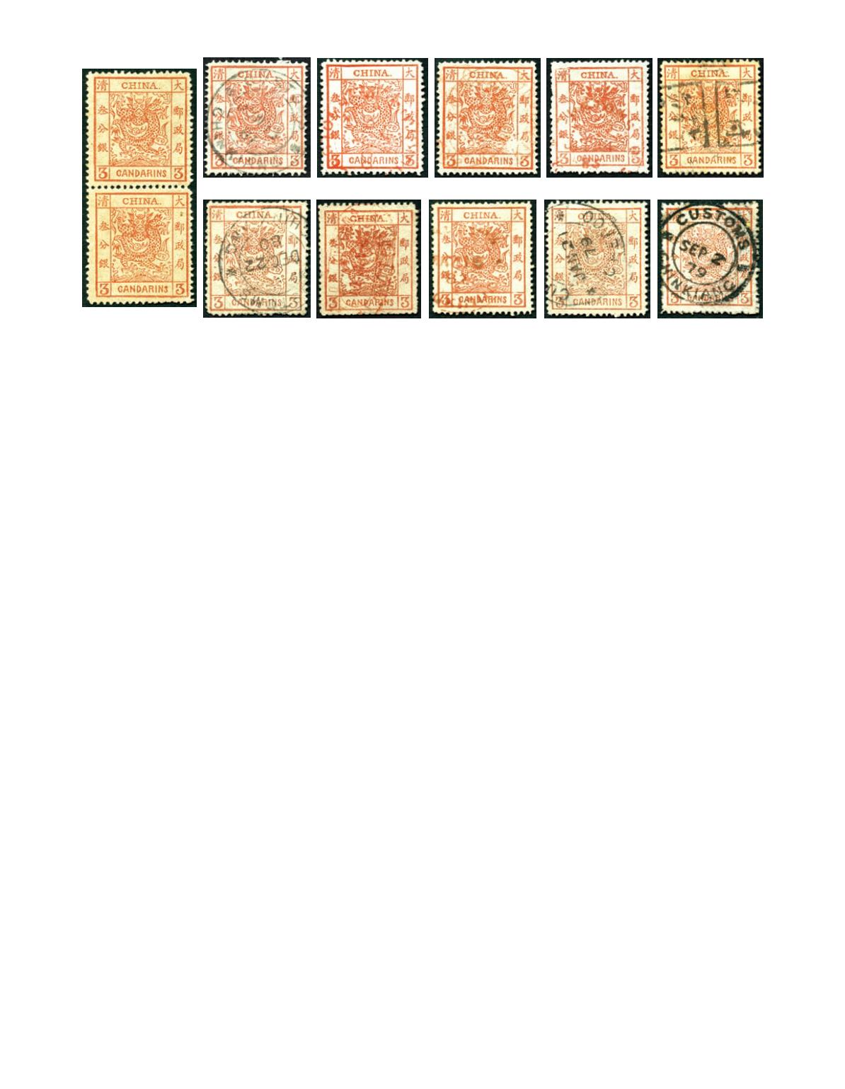 1878 Large Dragon thin paper, 3 cands vermillon with plate flaw at left mouth of dragon,