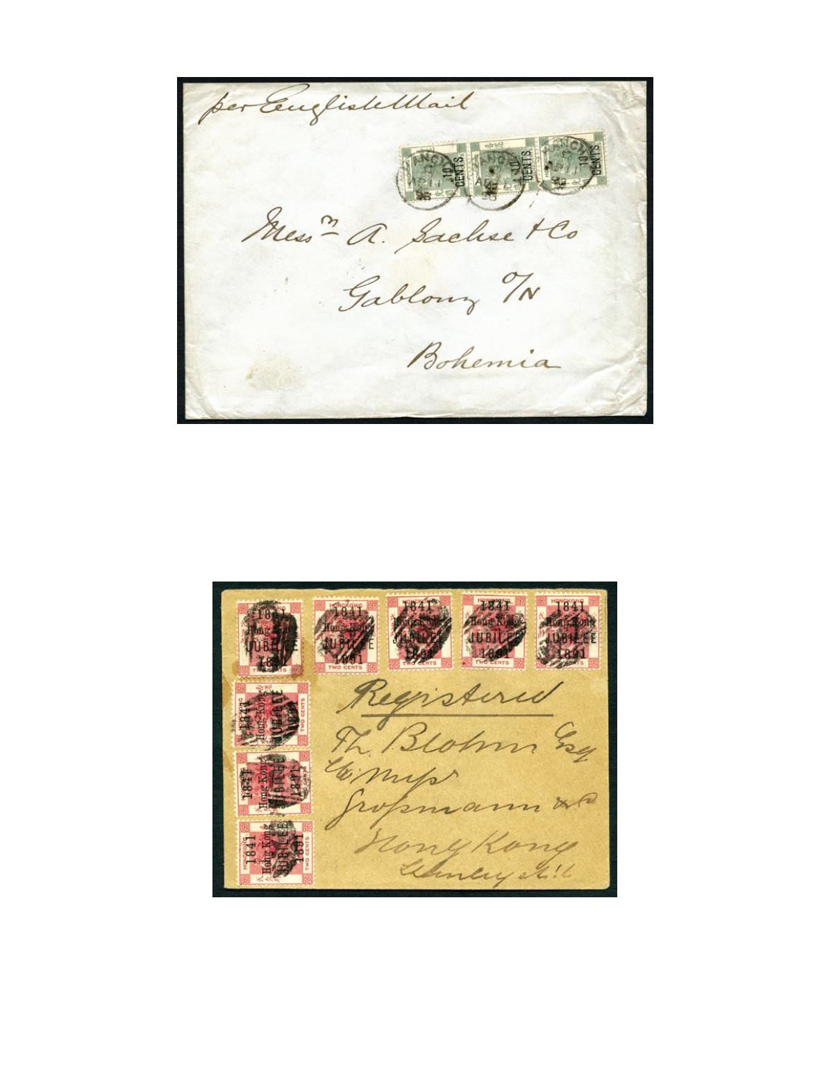 1898 (11 Apr.) A cover from Shanghai to Bohemia, via Hong Kong, bearing the rare surcharged 10c on 30c on grey green vertical