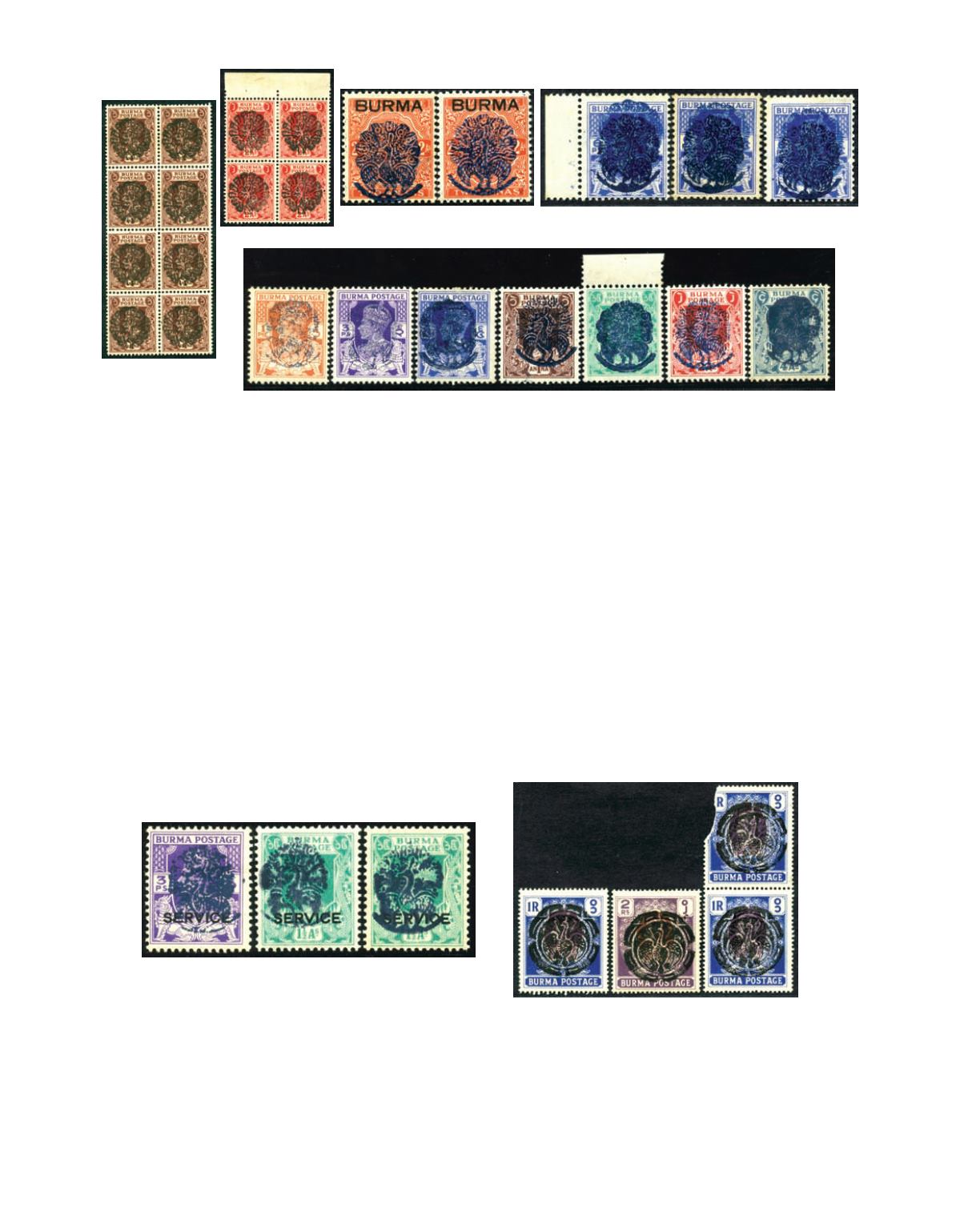 1942 Stamps of Burma KGVI with opt. Peacock on 6p bright blue x 3, each with opt. double variety. Mint and hinged, one stamp