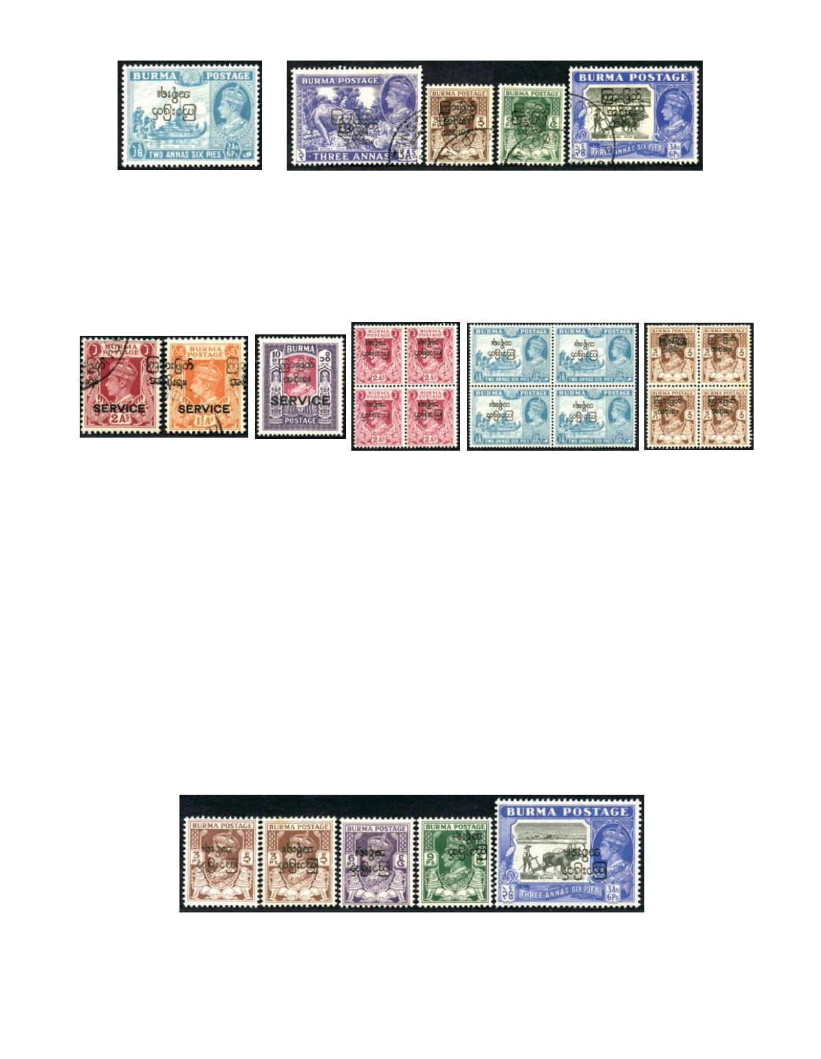 1947 Overprinted Interim Burmese Government on KGVI 3p brown x 2, 6p deep violet, 9p green and 3a6p black & ultramarine all