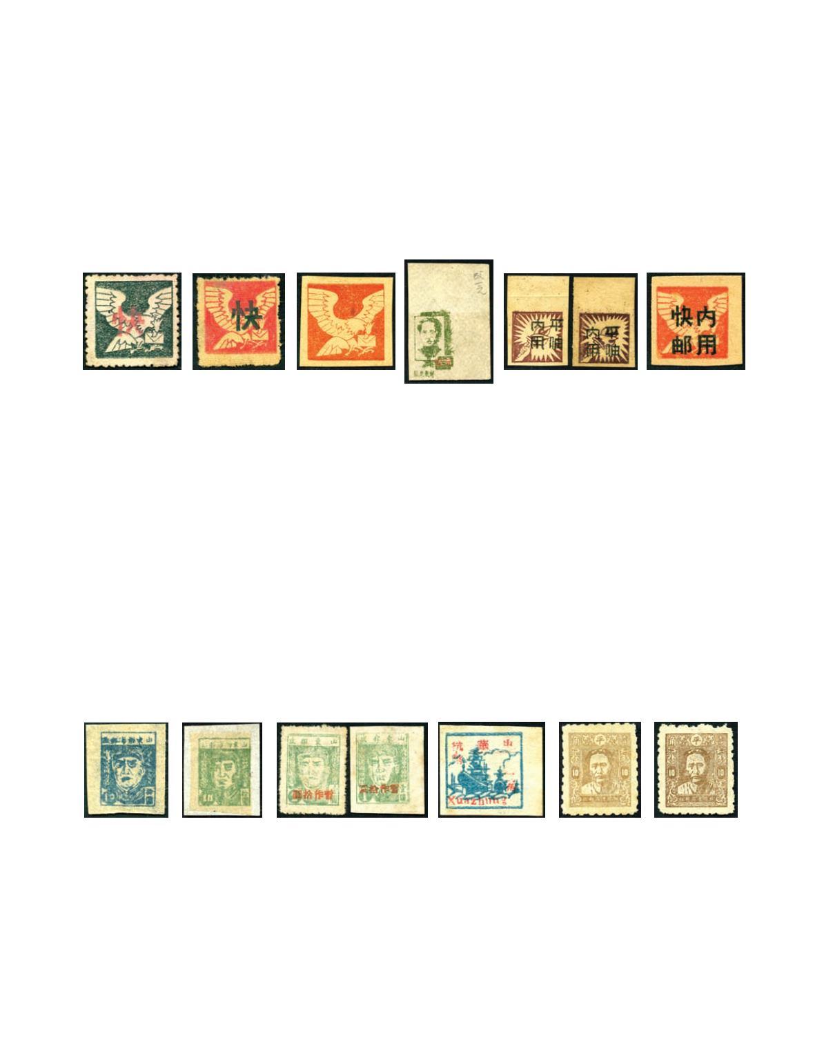 1946 Shangtung Post issue, Chu Teh portrait, basic stamp $1 green x 2, both with unlisted surcharged 'Temporary $10' in red, very