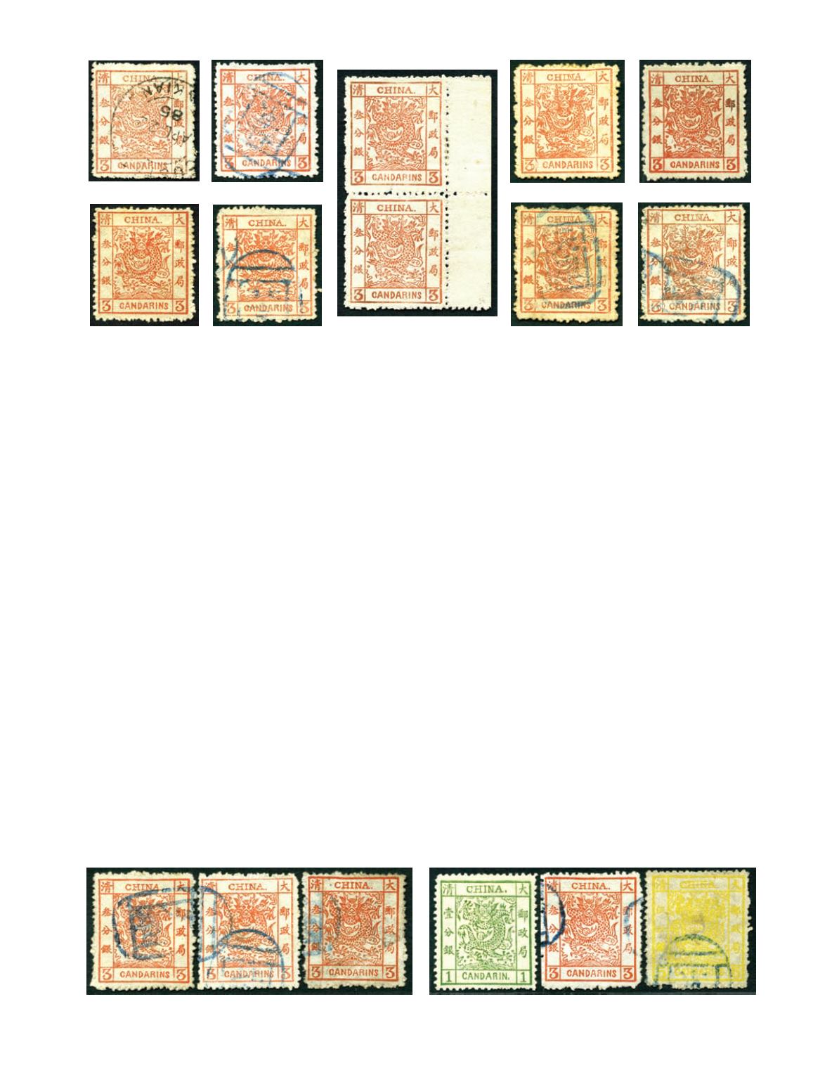 1885 Large Dragon thick paper rough perf. 3 cands vermilion, tied by full strike 'PEKING' seal chop in blue, very fine used. Chan