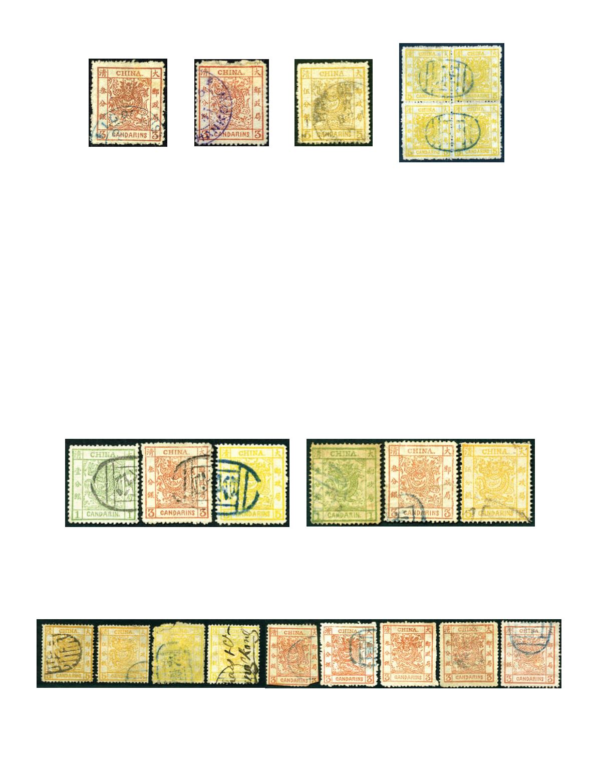 1883 Large Dragon thick paper clean cut perf. 1 cand to 5 cands, all tied by partial 'CHEFOO' seal chop, very fine. Chan 1, 8-9.
