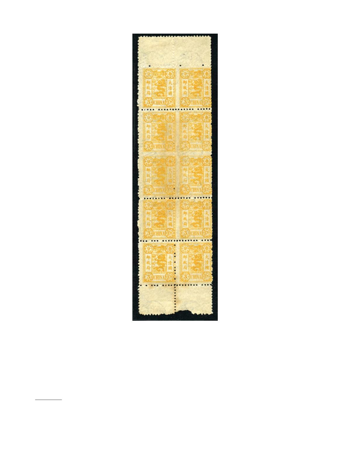 1894 Dowager first print 3 candarins orange-yellow, fabulous block of 10 (2 x 5) with interpane margins at top and foot, imperforate