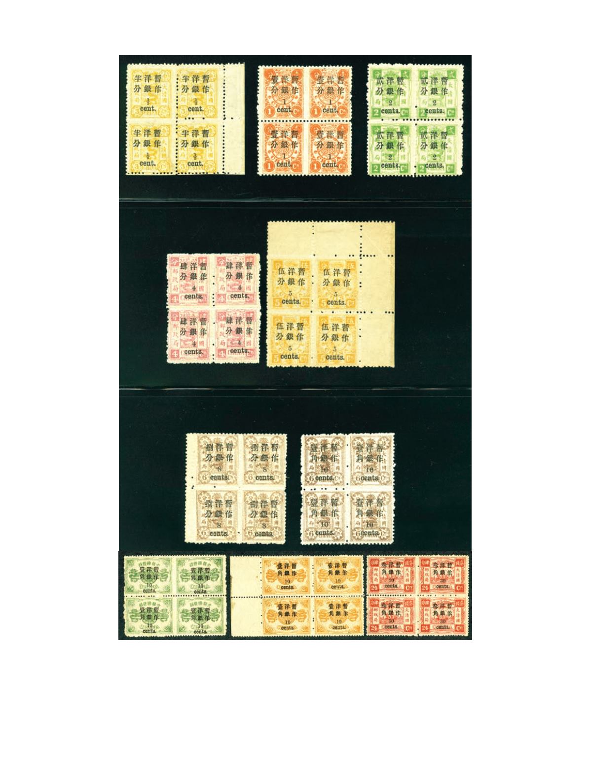 1897 Dowager small figures surcharge 1/2c on 3 cands to 30c on 24 cands complete of 9 in blocks of 4, 1/2c on 3 cands, 5c on 5