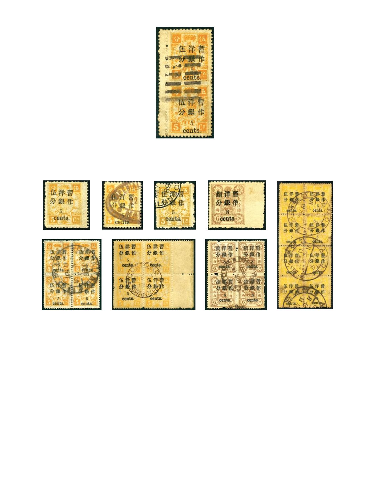 1897 Dowager small figures surcharged 5c on 5 cands dull orange block of 4, tied by full strike of 'CHINKIANG/24.7.97' Dollar