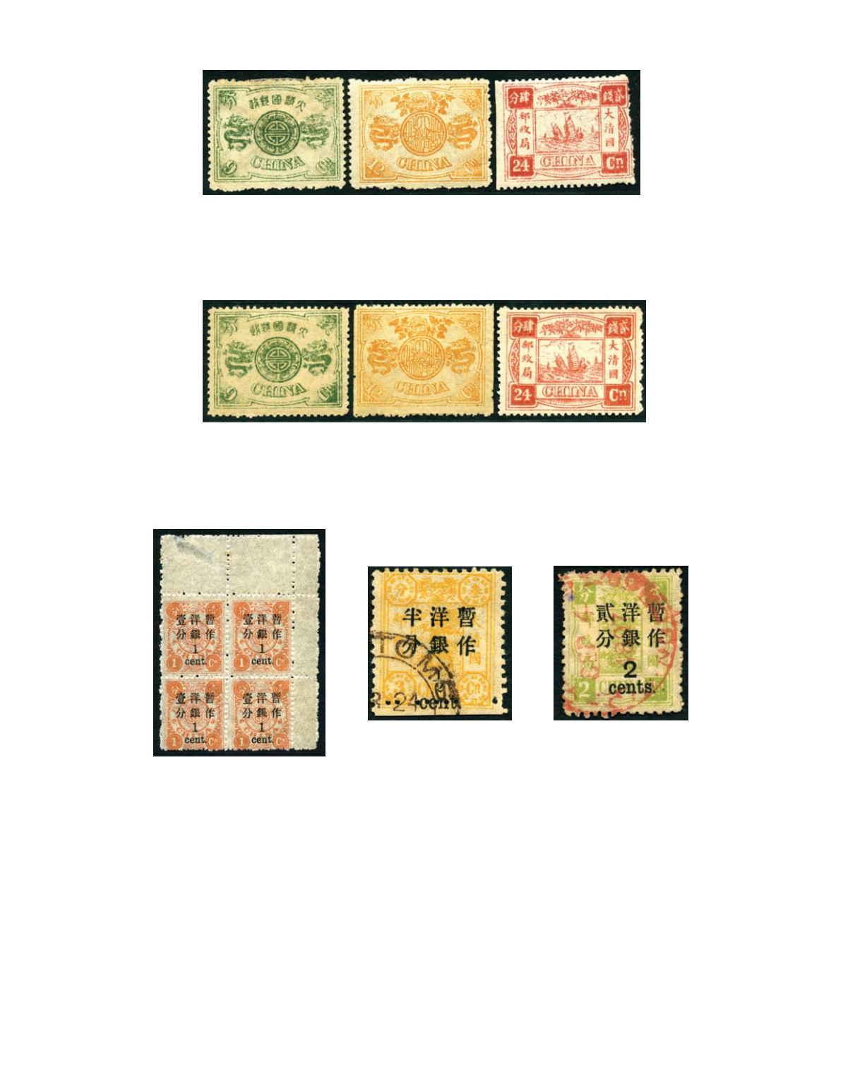 1897 Dowager large surcharges, with 2c on 2 cands tied by 'CUSTOMS/CHANGCHOW' cds in red, 2c on 2 cands block of 4 with