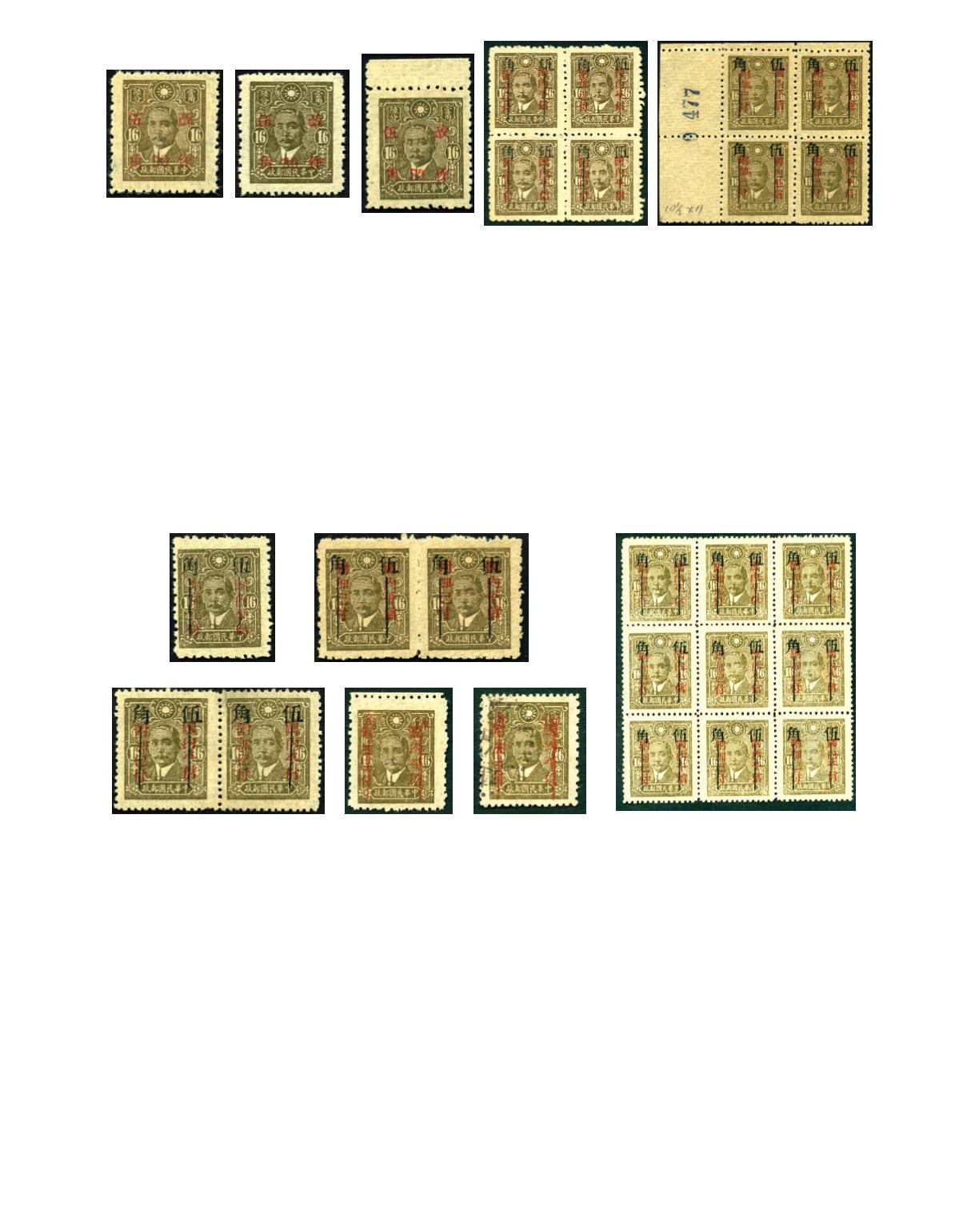 1942 Surcharge of 50 cents with 2 vertical bars on SYS Central Trust print 16c in block of 4, East Szechwan surcharge perf. 11,