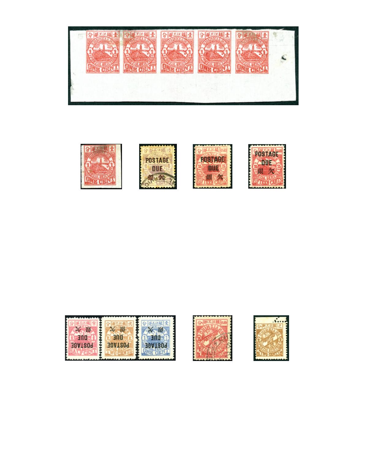 1894 Chinkiang Local Post 2nd issue (Golden Hill with clouds), 1c rose bottom horizontal strip of 5, essay, imperf. on thin laid