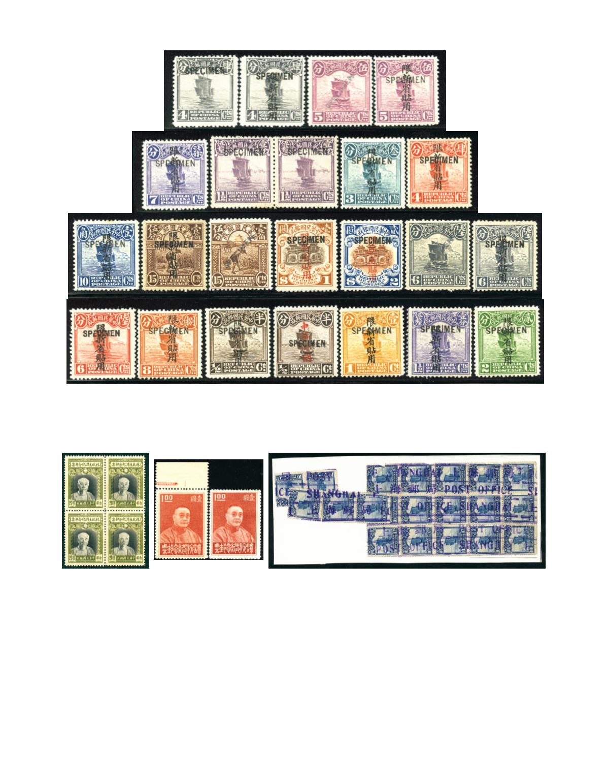 A small collection of various Junk issues with Specimen overprint, including 1 1/2c in pair, overprint 'For use in Sinkiang' on Hall