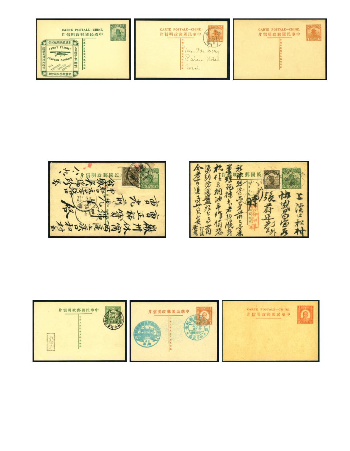 1933 ROC Junk 1c orange stationery pc x 3, 2 cands with printed message on back, one unused. Han 32. Fine. Photo