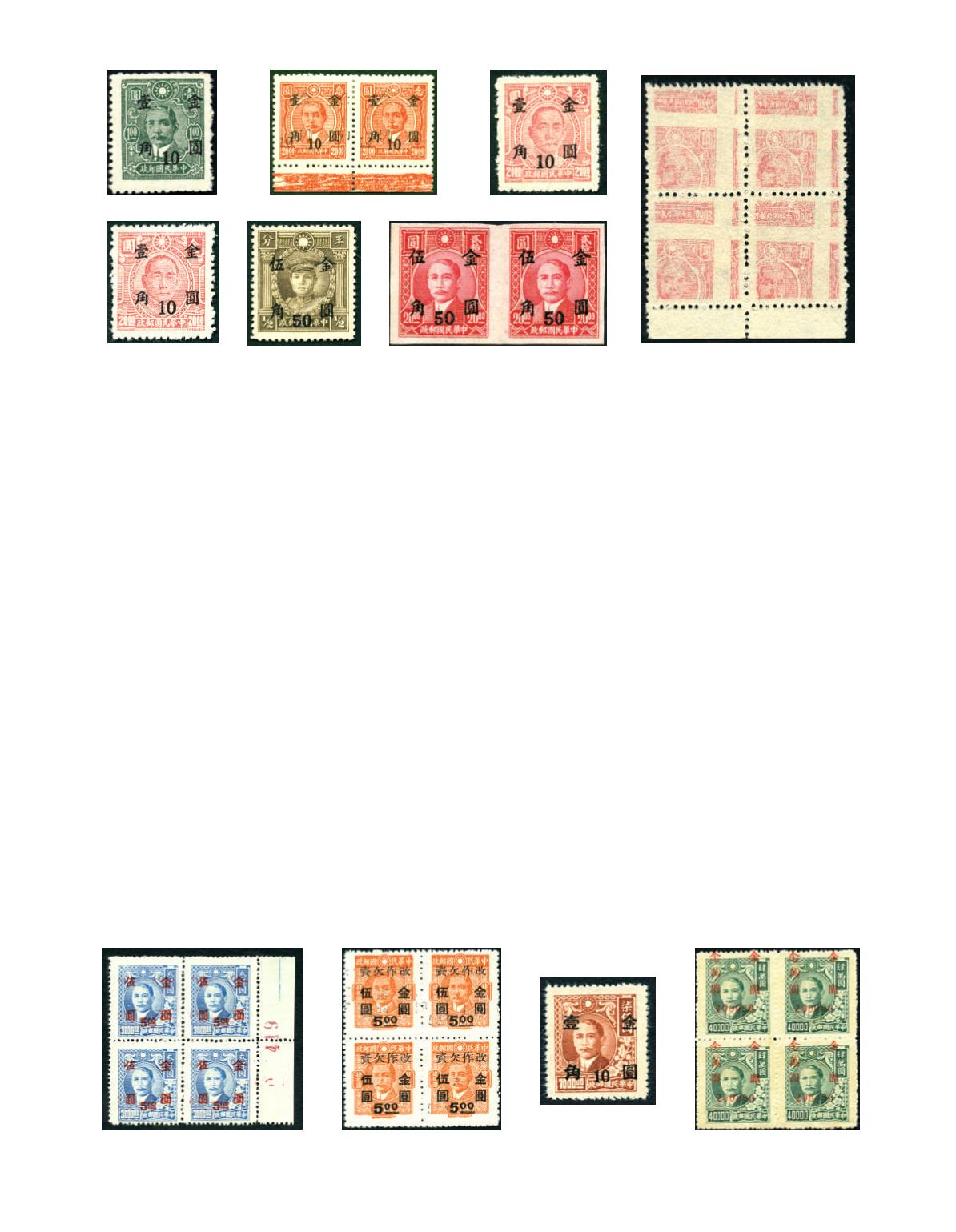 1948 Gold Yuan Shanghai Union Press surcharge, 10c on $20 carmine block of 4, SYS Chungking Chung Hwa print, with offset