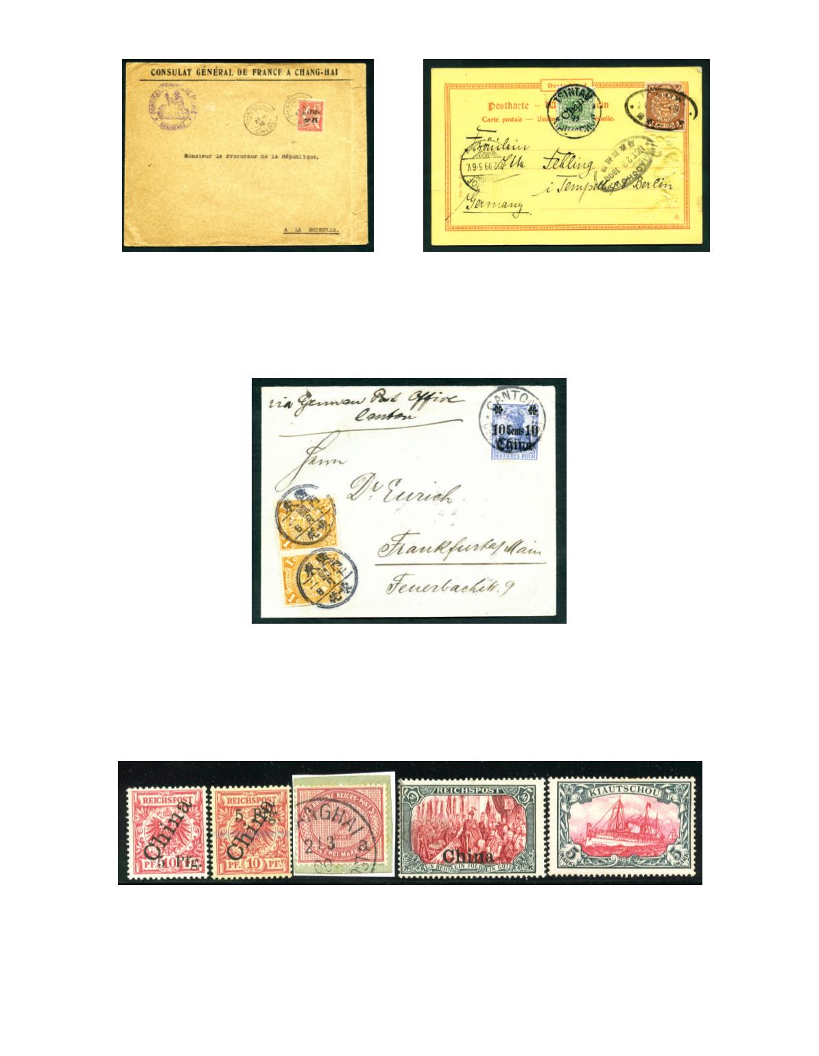 ) char. Lunar cds, alongside with surcharge 10c on 10f blue Germany stamp, tied by 'CANTON/15.1.07' Gr.P.O cds. On