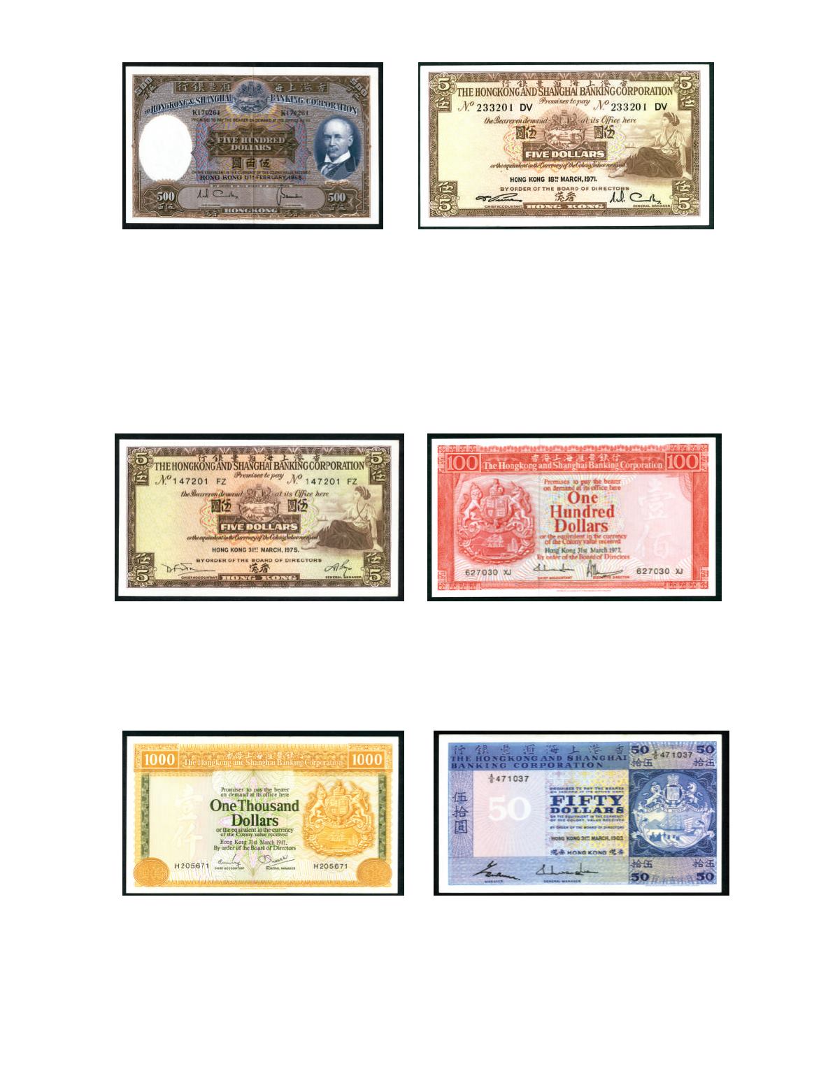 The Hong Kong and Shanghai Banking Corporation Ltd. 1977 $100 No. 627030XJ and 1980 $100 No. 822505YR. Both UNC.