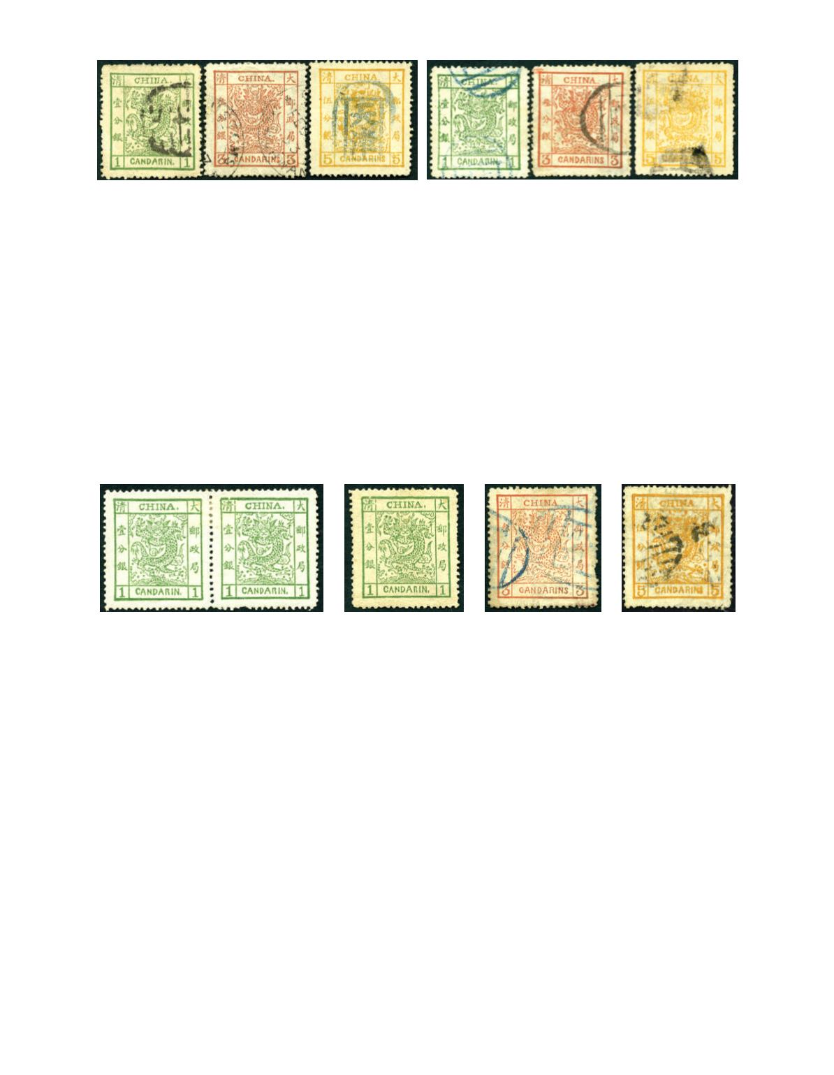 1882 Large Dragon wide margin, 5 cands yellow ochre, tied by partial ‘PEKING’ blue seal chop, fine used. Chan 6. Photo