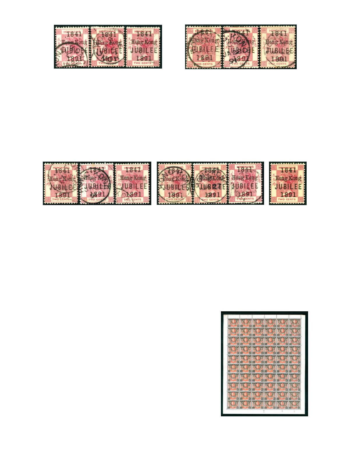 1891 Jubilee 2c used stamps x 3, all tied by ‘HONG KONG/22.1.91’ first day cancel, with necked 1st ‘E’ & bent 2nd ‘E’ in