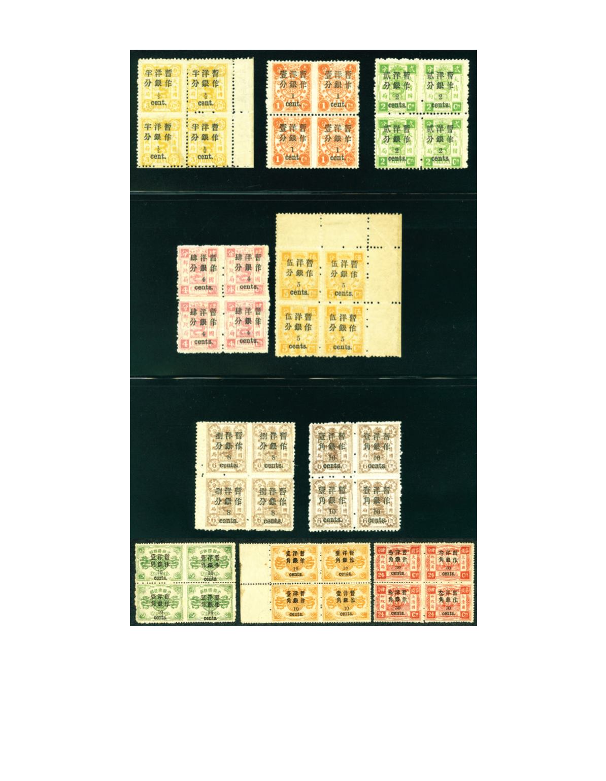 1897 Dowager small figures surcharge 1/2c on 3 cands to 30c on 24 cands complete of 9 in blocks of 4, 1/2c on 3 cands, 5c on 5