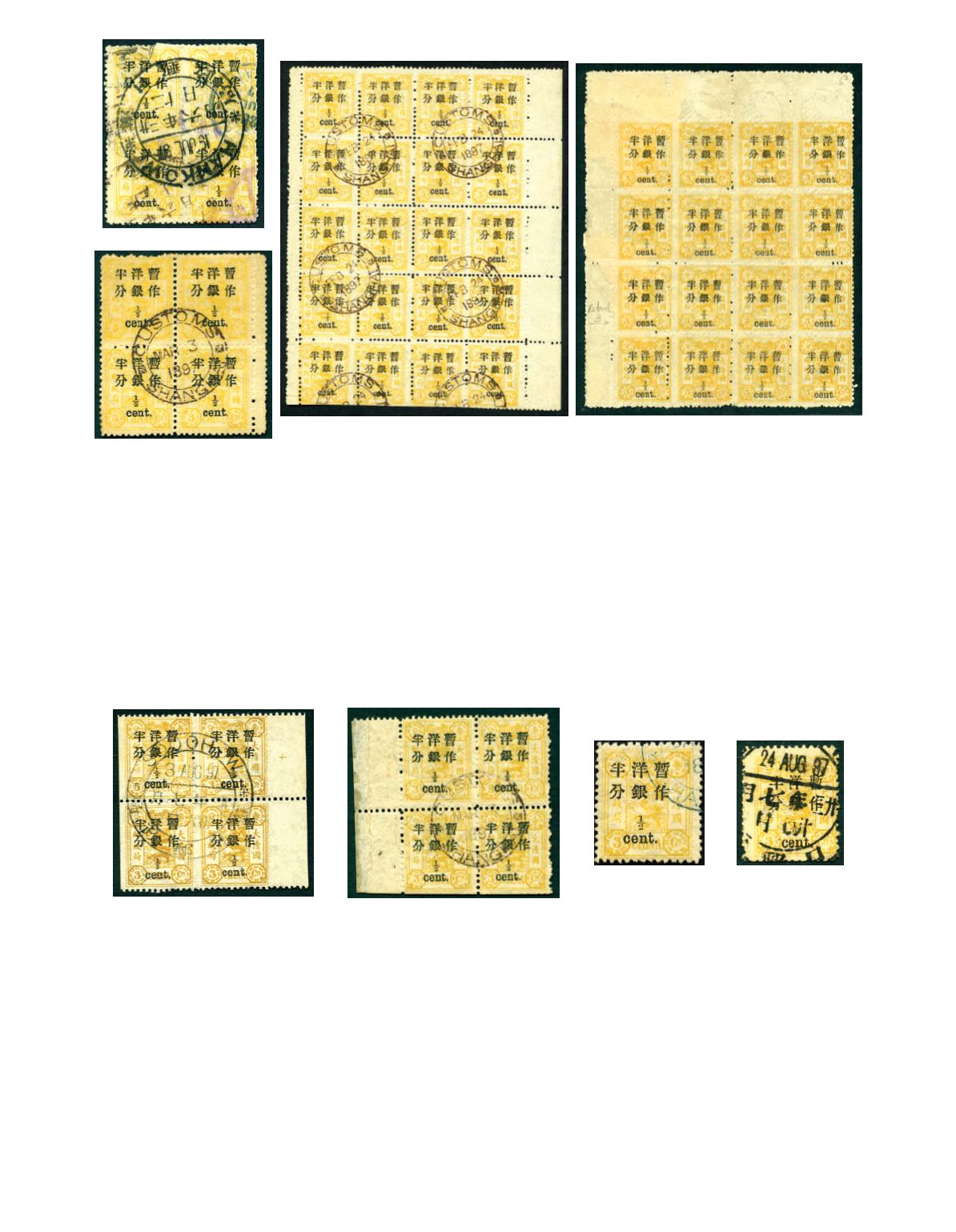 'n' of 'cent' variety (Chan 37f), and bottom left stamp surcharged figures '1/2' over 'e' of 'cent' variety (Chan 37e), tied by full strike