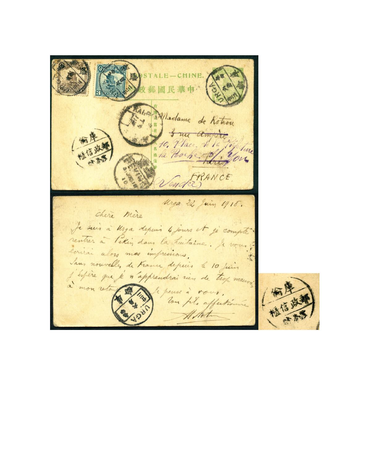 1918 (23 June) A ROC Junk 1c light green stationery card from Urga to France, with additional Junk Peking print 1/2c & 3c,