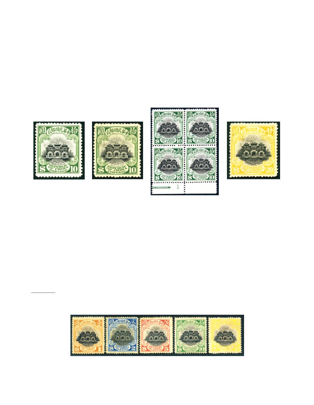 1914 First Peking print, Hall of Classics $1 black & ochre, upper right corner copy with plate no. unmounted and fresh, very fine.