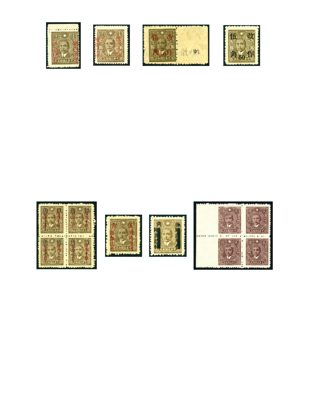 1942 Surcharge of 50 cents with 2 vertical bars on SYS Central Trust print 16c in block of 4, East Szechwan surcharge perf. 11,