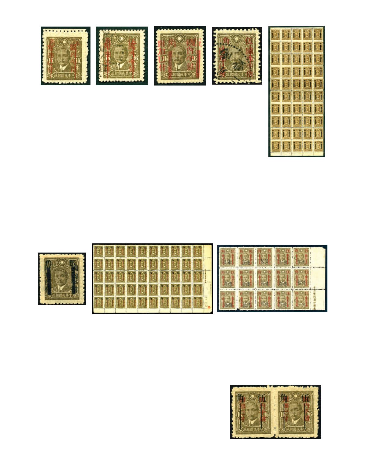 1943 50 cents surcharge with 2 vertical bars on SYS 16c Central Trust print, East Szechwan surcharged, large block of 50, perf.