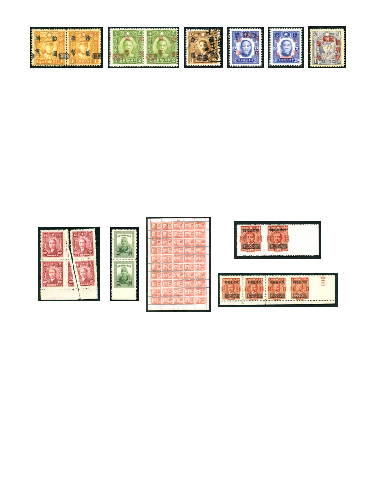1946 SYS First Shanghai Dah Tung print, $100 deep carmine block of 4, with dramatic paper fold variety resulting in 2 stamps