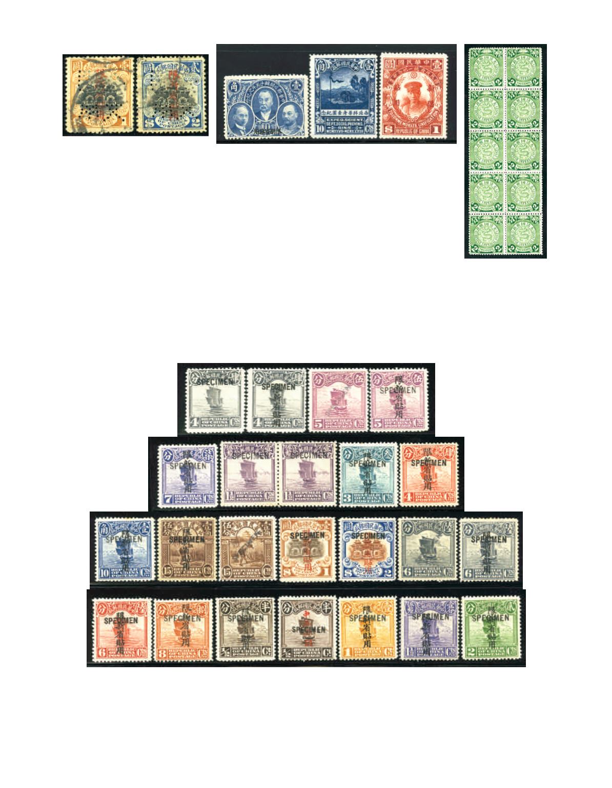 A small collection of various Junk issues with Specimen overprint, including 1 1/2c in pair, overprint 'For use in Sinkiang' on Hall