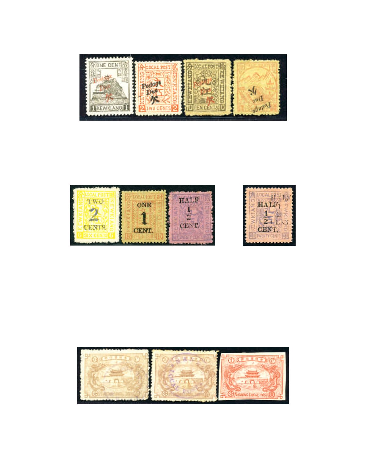 A specialized collection of Kewkiang Local Post Postage Due stamps hinged on an old time pages, including short set of 8 used