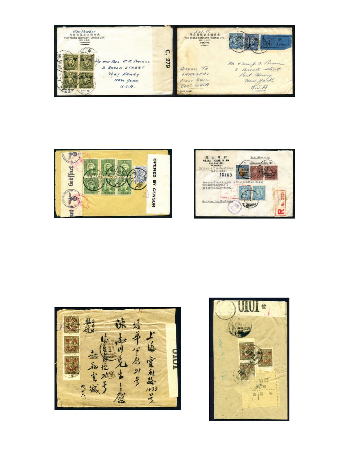 of 4, tied by bilingual 'TIENTSIN' cds, with Examined By C.279 censor seal label, another cover with small char. overprinted
