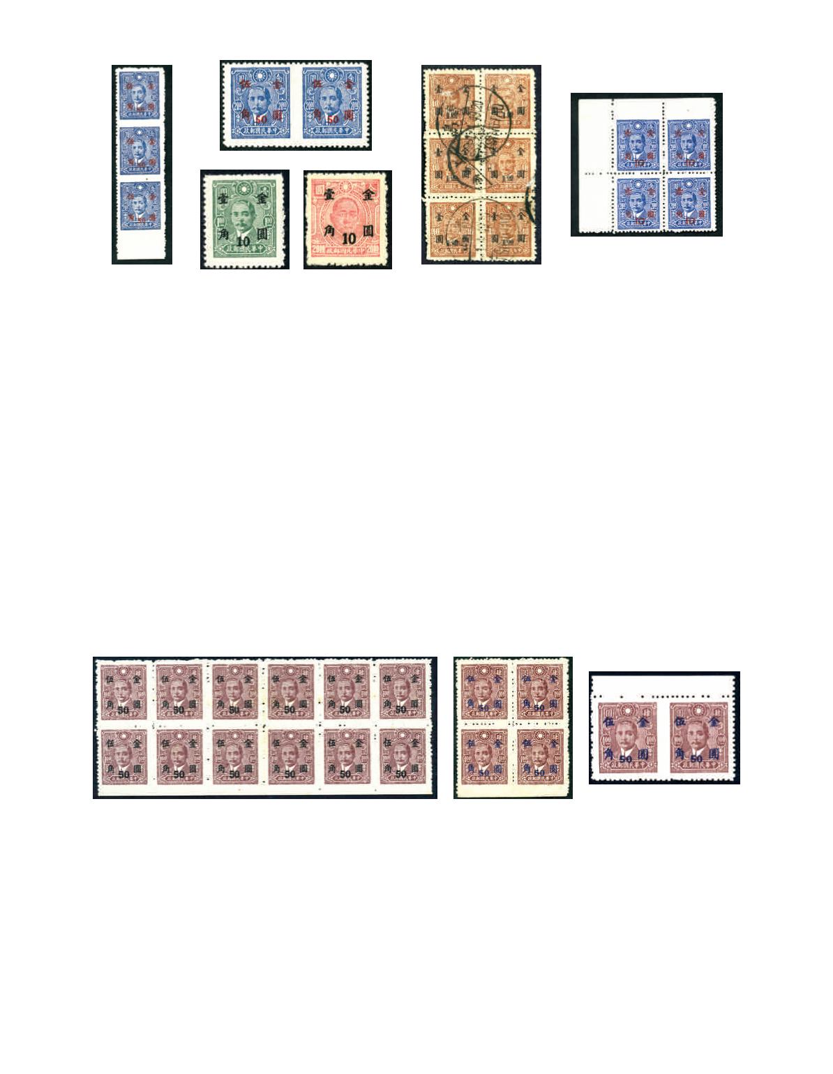 1948 Gold Yuan Shanghai Sanyi surcharged 50c on $2 blue SYS Paicheng print, block of 4 with imperf. at top margin variety,