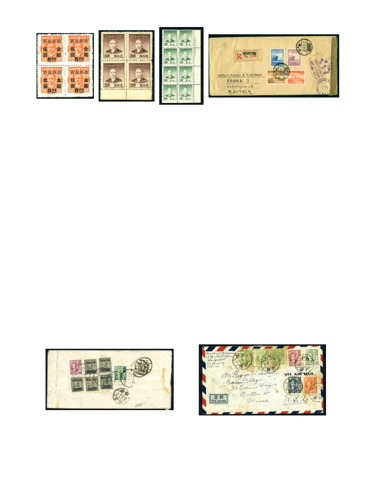 1949 Gold Yuan Shanghai Central print, $20 brown purple block of 4 and bottom two stamp with diagonal paper folded variety,