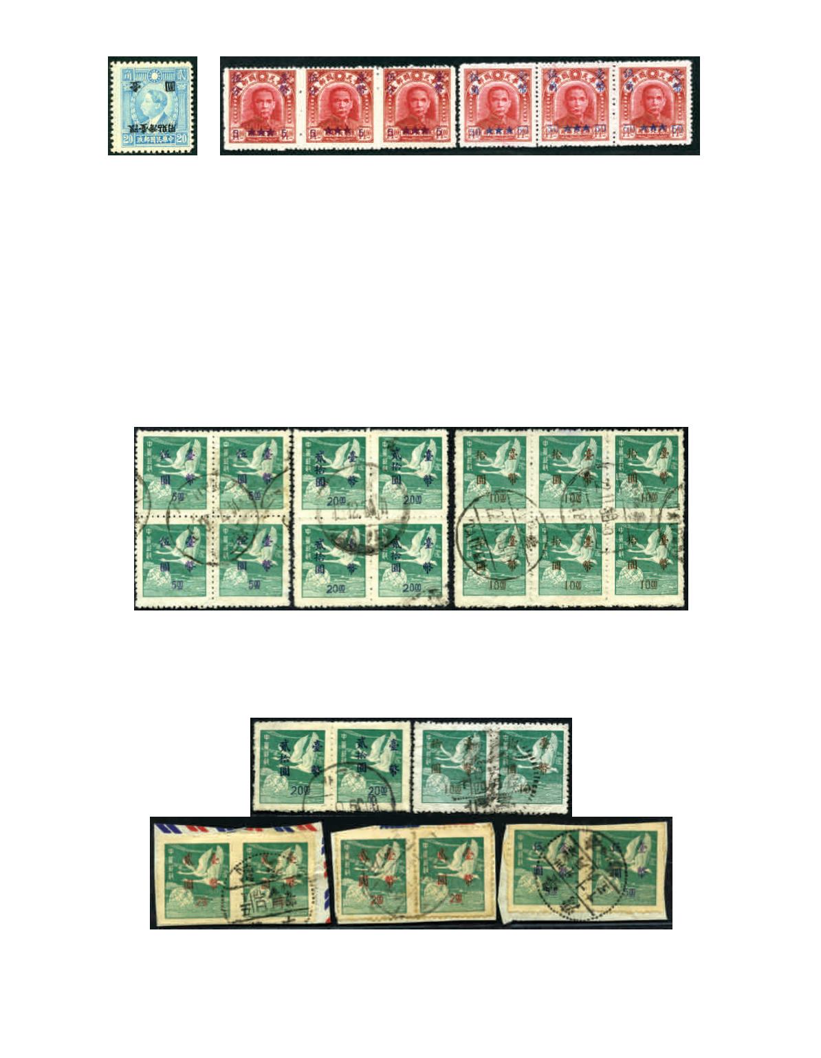 1950 Flying Geese surcharged 1st issue, $5 block of 4, $10 block of 6 with top left stamp broken Chinese char. 'Tai' (