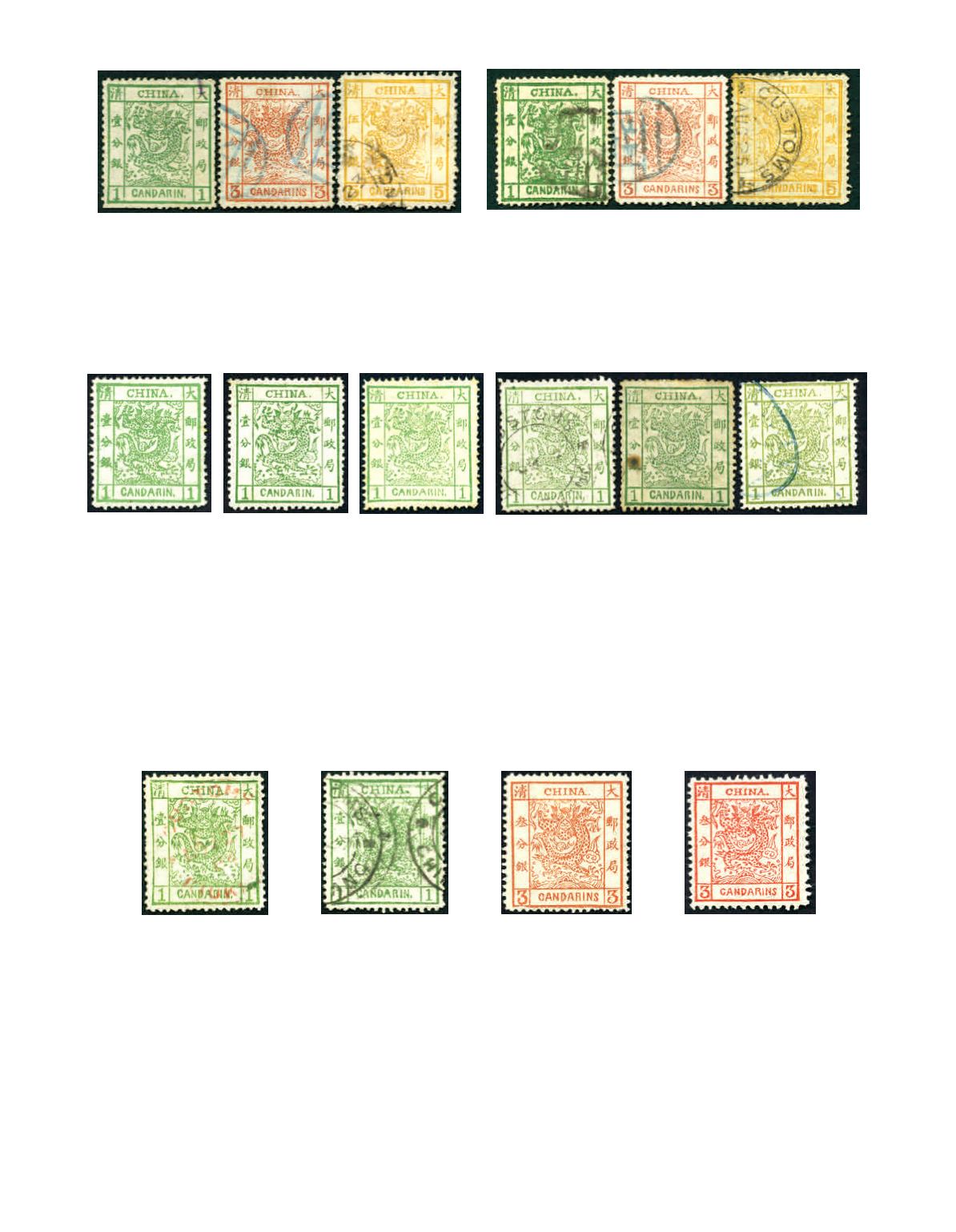 1878 Large Dragon thin paper, 1 cand green x 3, used with different cancellations, good to fine. Chan 1. Photo